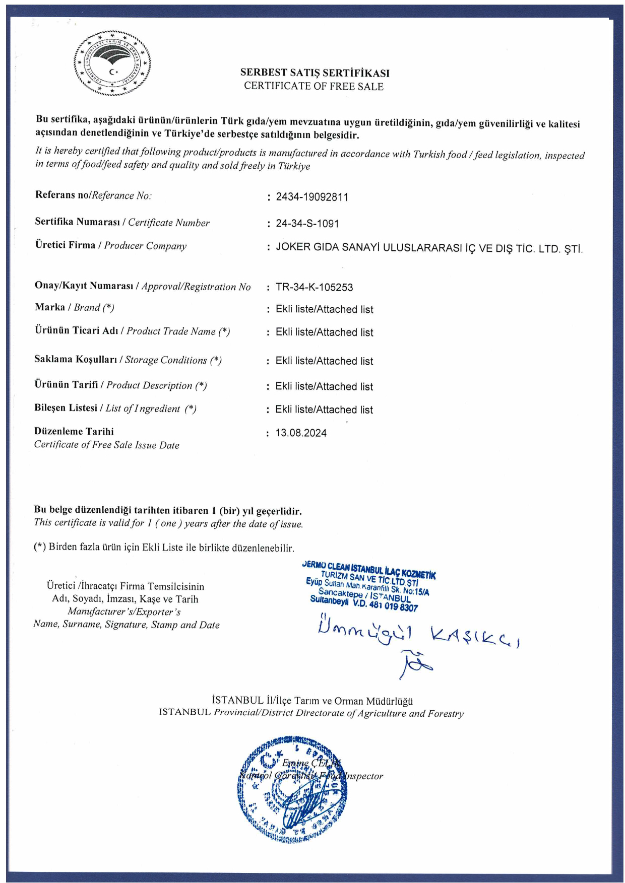 GIDA TAKVİYESİ SERBEST SATIŞ SERTİFİKASI
